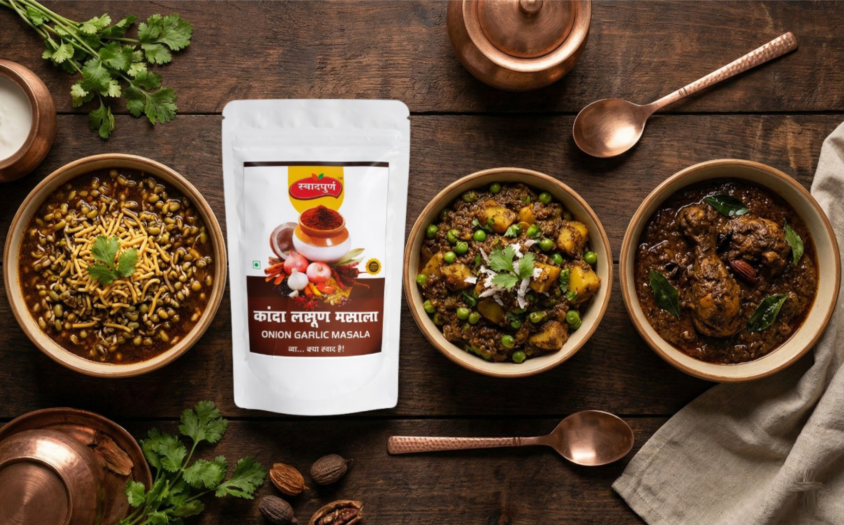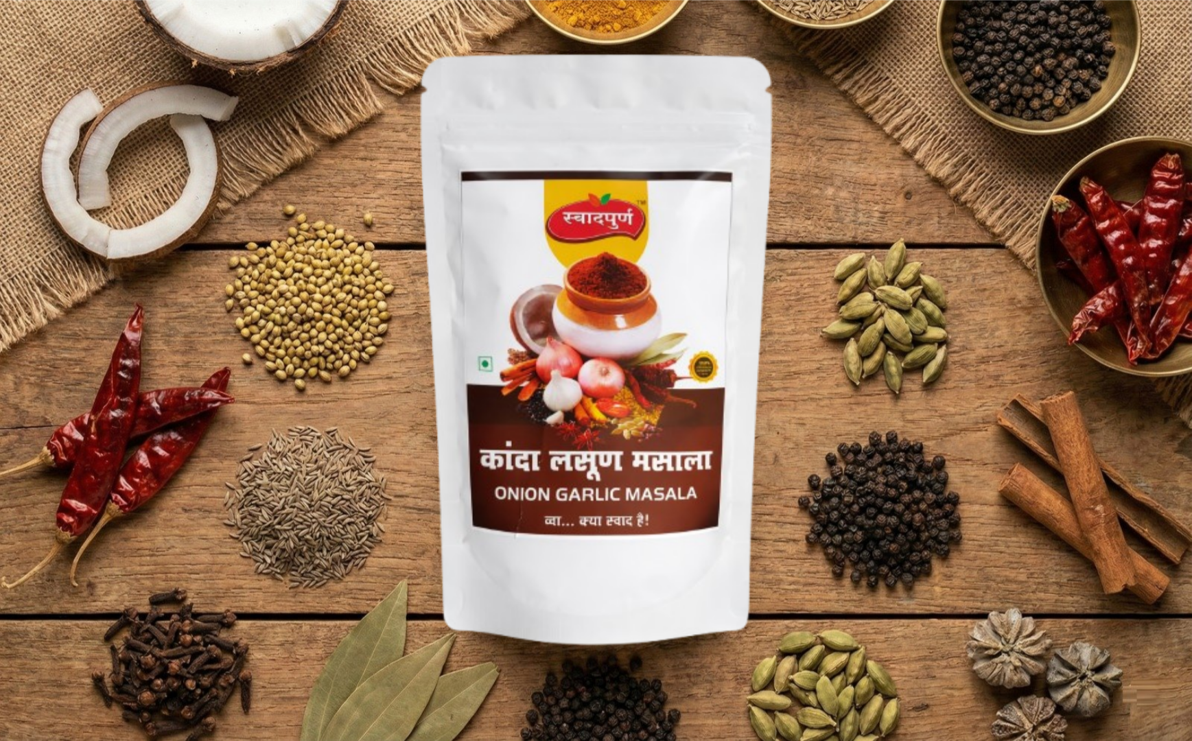 * Experience the true taste of Maharashtrian kitchens with SWAADPURNA Onion-Garlic Masala (Kanda Lasun Masala) – a premium spice blend made from roasted onions, garlic, dry coconut, and carefully selected spices.